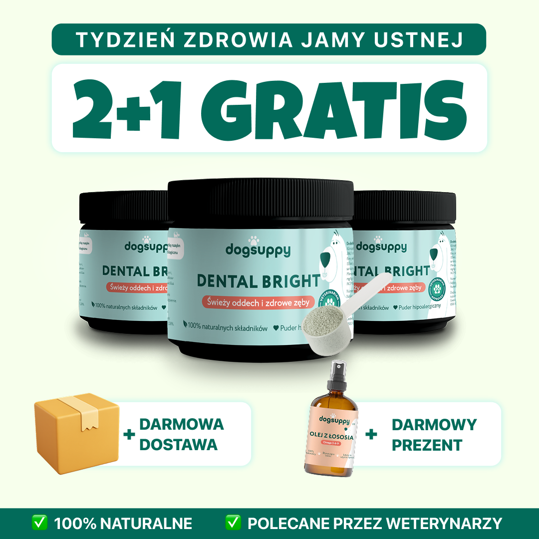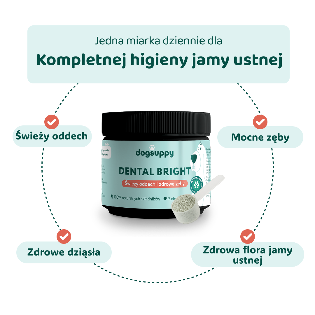Uwaga: Dental Bright to naturalny suplement, który wspomaga codzienną higienę jamy ustnej, pomagając utrzymać świeży oddech i zdrowe zęby. Nie zastępuje jednak porady lekarza weterynarii, ani dentysty.